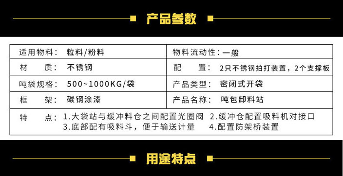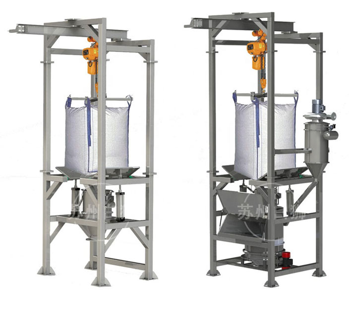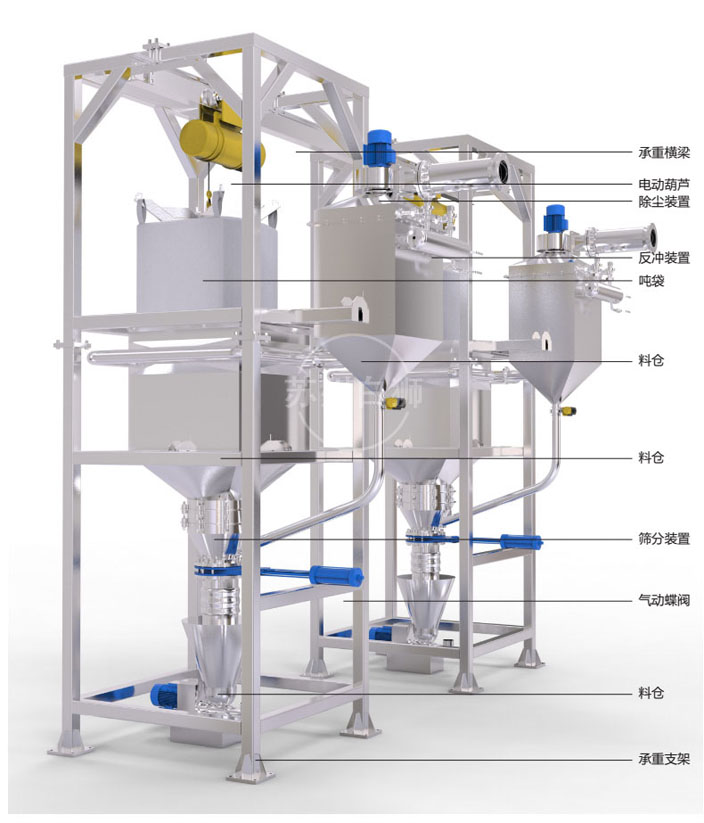 噸包投料站(又名噸袋拆包機):用于噸袋物料用電葫蘆或者叉車很容易將噸包輸送至拆包工位上。設備內置過濾除塵裝置,使人工在操作中僻免環境污染及人工呼吸傷害,使人工能在清潔的環境中輕松工作。