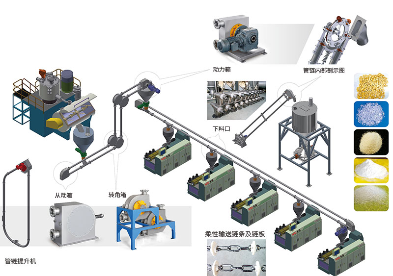 管鏈輸送機適用于化工行業;如聚酯工程,煤化工;食品行業;米面,淀粉等易生產粉塵的場所。