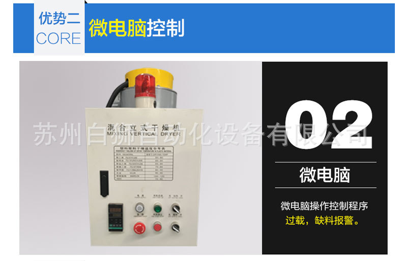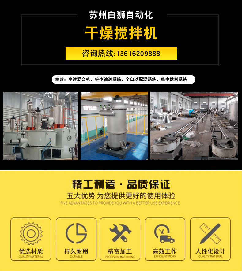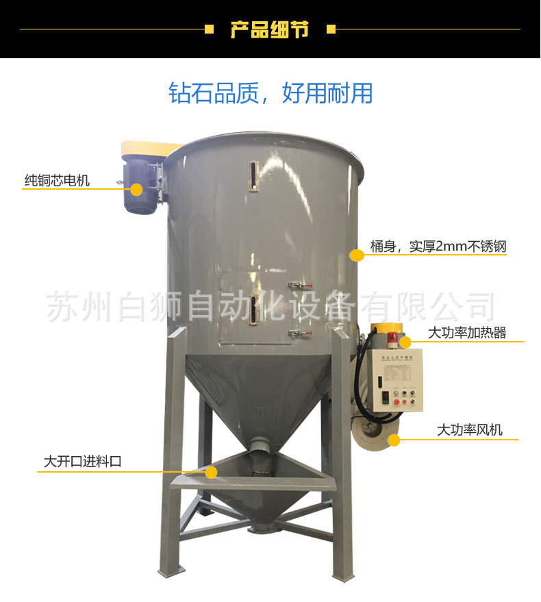 8、干燥混合功能二合一,當(dāng)不需要干燥時,只需將加熱開關(guān)及風(fēng)機(jī)開關(guān)關(guān)閉,標(biāo)準(zhǔn)機(jī)型即可用于塑料攪拌均化用途,一機(jī)二用。塑料攪拌機(jī)