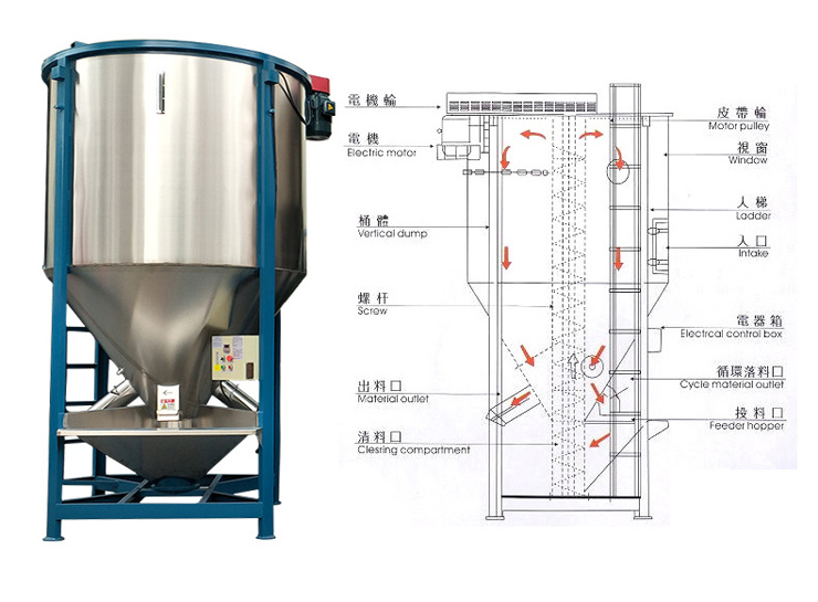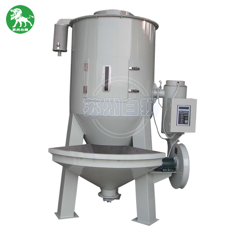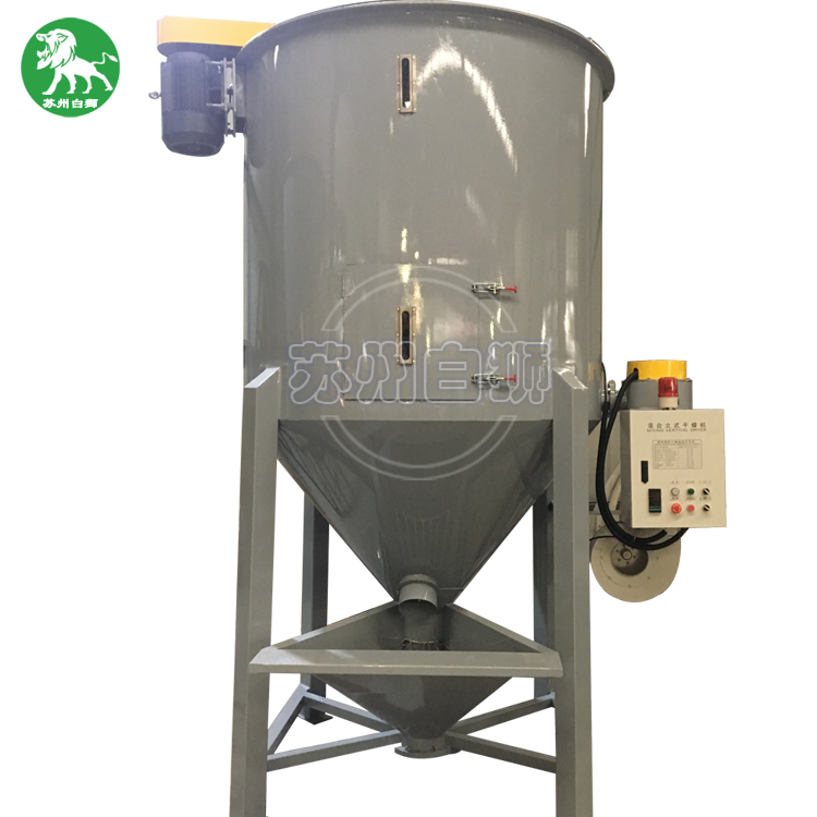 塑料顆粒烘干攪拌機:白獅大型立式混料機,采用螺旋攪拌工作之原理,將投入投料斗中的物料通過螺旋主軸輸送到桶體上端,再以傘狀形落下且一直持續循環攪拌,從而達到混勻的目的。